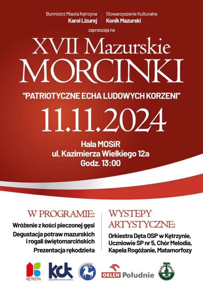 11 listopada mieszkańcy Miasto Kętrzyn mają potrójną okazję do świętowania. Jednocześnie obchodzą bowiem Narodowe Święto Niepodległości, rocznicę nadania praw miejskich oraz Dzień św. Marcina – przy okazji którego organizowane są mazurskie morcinki.Burmistrz Miasta Kętrzyn oraz Stowarzyszenie Kulturalne „Konik Mazurski” serdecznie zapraszają na XVII MAZURSKIE MORCINKI pod hasłem „Patriotyczne echa ludowych korzeni”, które odbędą się 11…