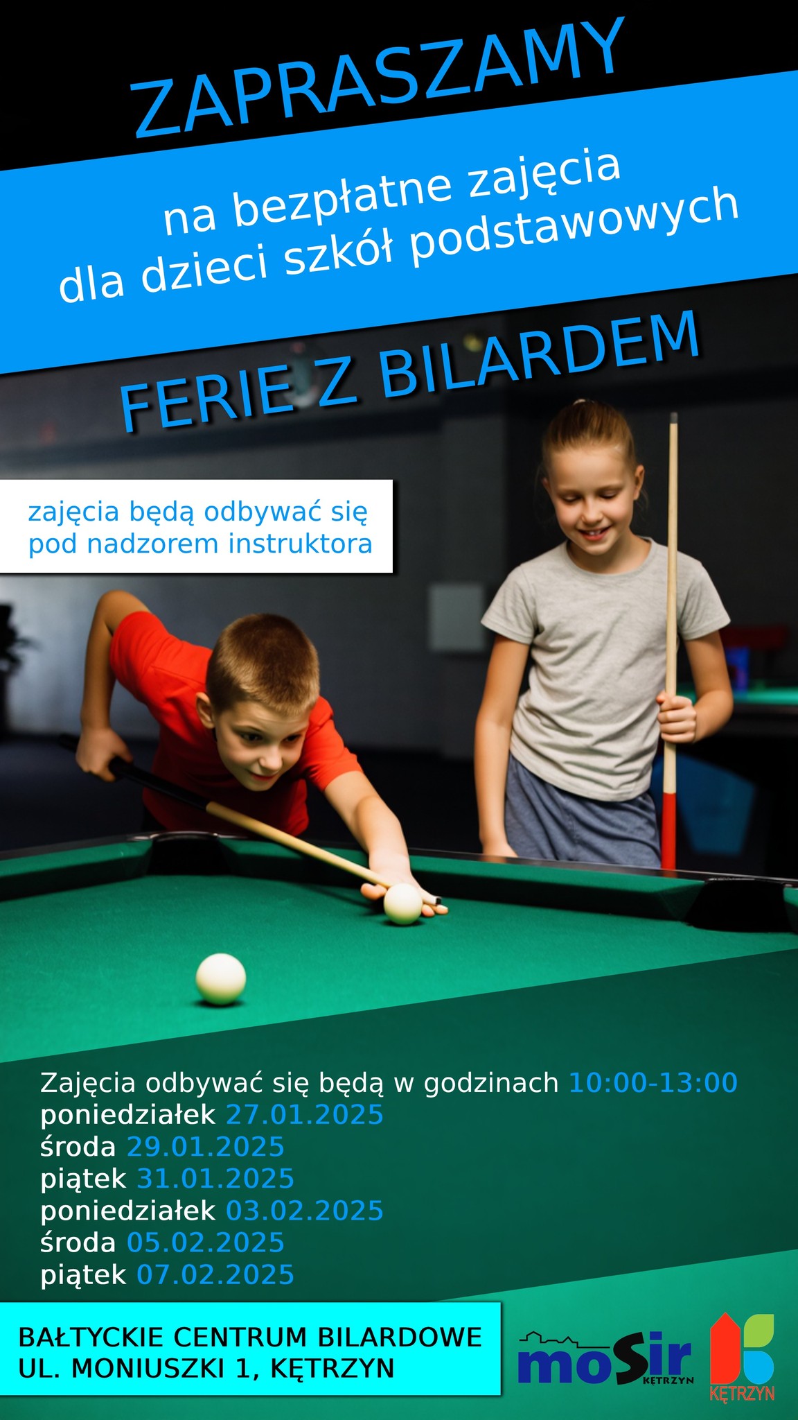 Już w następny poniedziałek rozpoczną się ferie zimowe. Zapraszamy do skorzystania z bezpłatnych zajęć bilardowych organizowanych przez Miejski Ośrodek Sportu i Rekreacji.