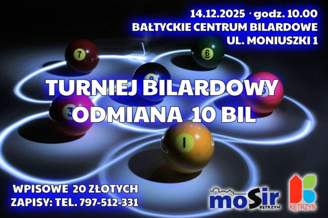 W dniu 14.12.2025 roku o godzinie 10 odbędzie się Turniej Bilardowy 10 bil. Sala otwarta od godziny 9. Wpisowe 20 złotych.Szczegóły i zapisy pod numerem telefonu: 797 512 331.Zapraszamy do udziału.