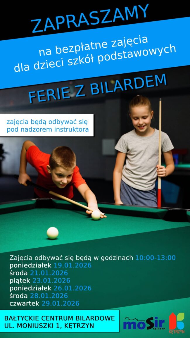 Już w następny poniedziałek rozpoczną się ferie zimowe. Zapraszamy do skorzystania z bezpłatnych zajęć bilardowych „Ferie z Bilardem” organizowanych przez Miejski Ośrodek Sportu i Rekreacji. Spotkania z instruktorem odbędą się w godzinach od 10:00 do 13:00 oraz dniach:– poniedziałek – 19.01.2026– środa – 21.01.2026– piątek – 23.01.2026– poniedziałek – 26.01.2026– środa – 28.01.2026– czwartek –…