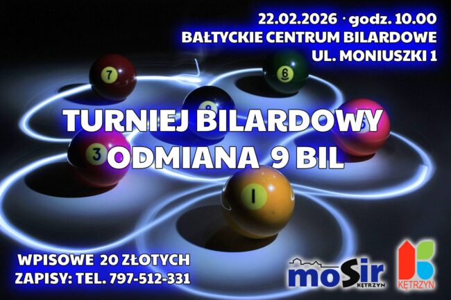 W dniu 22.02.2026 roku o godzinie 10 odbędzie się Turniej Bilardowy 9 bil. Sala otwarta od godziny 9. Wpisowe 20 złotych.Szczegóły i zapisy pod numerem telefonu: 797 512 331.Zapraszamy do udziału.