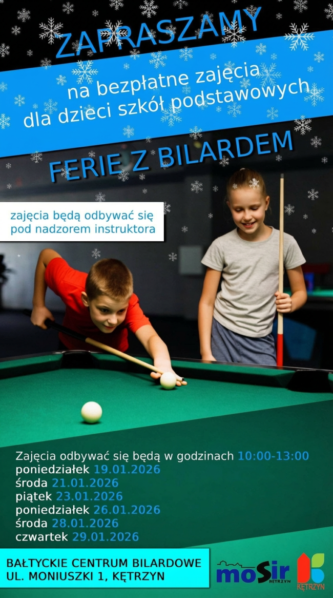 Za nami pierwszy dzień nauki gry w bilard. Podczas zajęć prowadzony jest trening podstaw gry – prawidłowa postawa, zasady gry oraz celowania. Nie brakuje również dobrej zabawy i pozytywnych emocji przy stole bilardowym. Dziękujemy za pierwszy dzień i zapraszamy na kolejne dni Ferii z Bilardem.Harmonogram zajęć:21.01.2026 godz. 10:00-13:0023.01.2026 godz. 10:00-13:0026.01.2026 godz. 10:00-13:0028.01.2026 godz. 10:00-13:0029.01.2026 godz.…